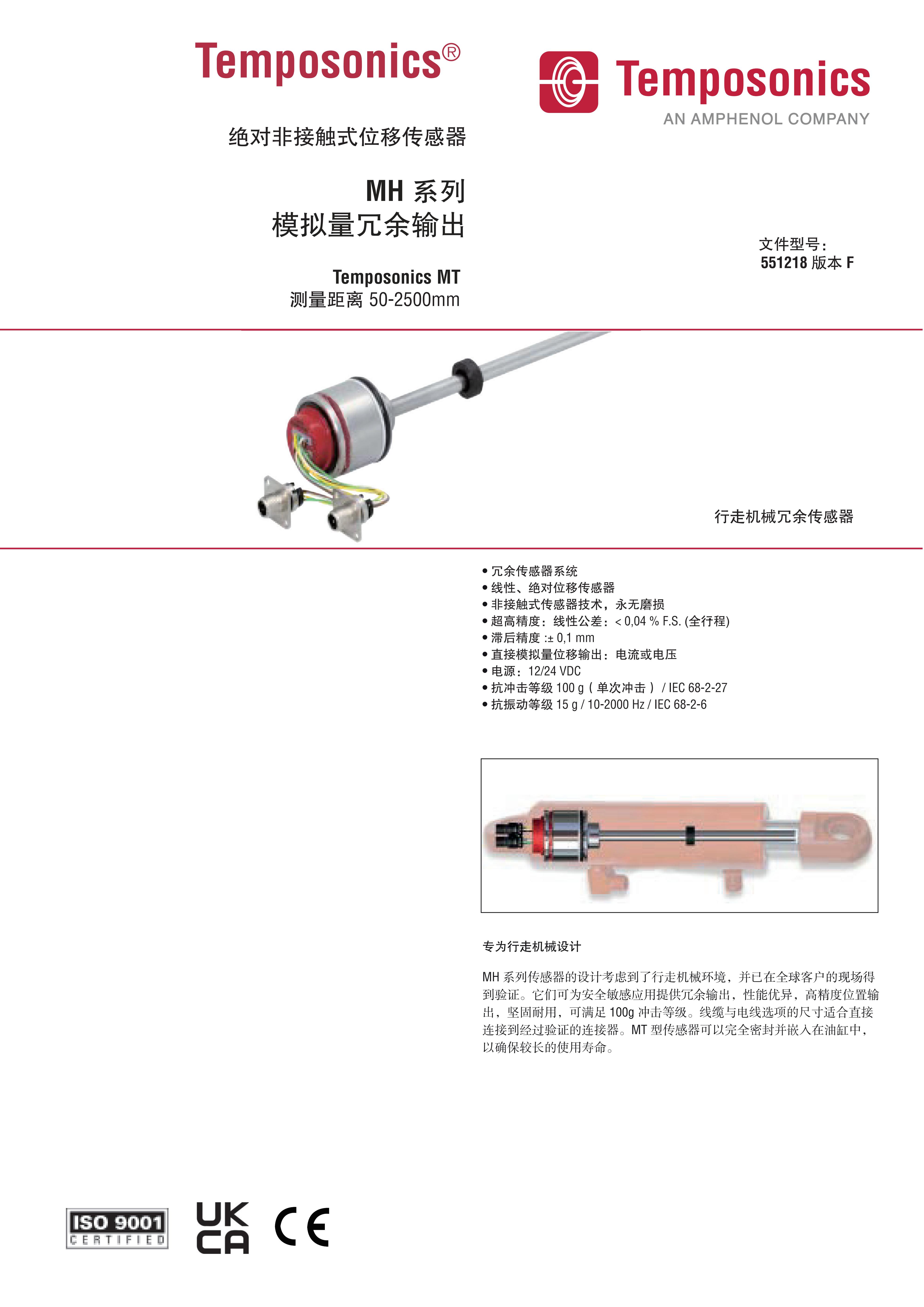 Temposonics MT系列是专为移动液压场景打造的冗余式磁致伸缩线性位移传感器,以“双冗余设计、坚固、高精度输出”为核心优势,依托成熟的磁致伸缩非接触技术,适配安全敏感型应用,为各类紧凑型标准液压缸提供稳定可靠的绝对式位置测量,是移动液压领域高要求场景的理想选择。